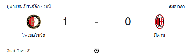 - นาทีที่ 97 กรรมการเป่านกหวีดจบเกม เฟเยนูร์ดเอาชนะเอซี มิลาน 1-0