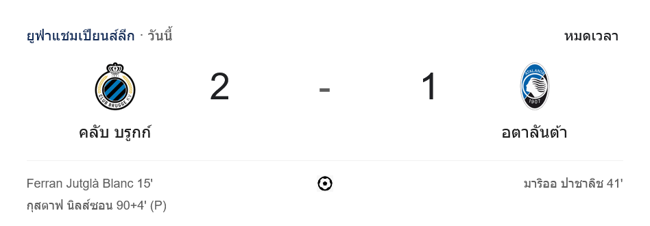 - 🔚 จบเกม – คลับบรูซ ชนะ อตาลันต้า 2-1