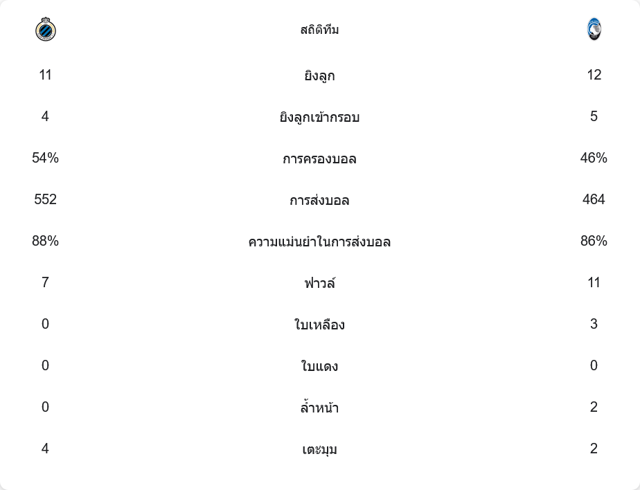 แม้ว่าคลับบรูซจะครองบอลได้ 54% และมีเปอร์เซ็นต์ผ่านบอลแม่นยำ 88% ซึ่งเหนือกว่าอตาลันต้าที่มีเพียง 46% แต่ฝั่งทีมเยือนก็มีโอกาสยิงมากกว่า 12 ครั้ง เทียบกับเจ้าถิ่นที่ยิง 11 ครั้ง แต่สุดท้ายความเด็ดขาดของคลับบรูซในช่วงท้ายเกมก็ทำให้พวกเขาเป็นฝ่ายชนะ