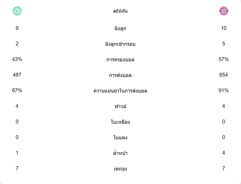 บาเยิร์นครองบอลเหนือกว่า 57% ส่วนเซลติกได้ 43%