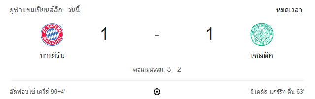 - นาทีที่ 96 กรรมการเป่านกหวีดจบเกม บาเยิร์น มิวนิคเสมอเซลติก 1-1!