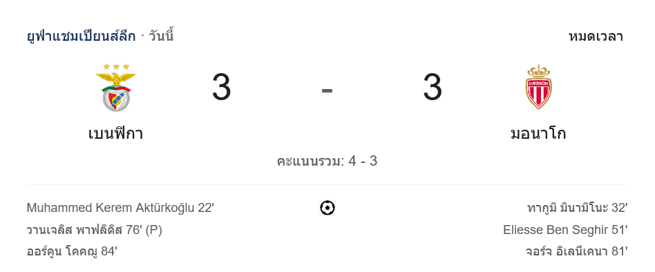 จาก : ผลบอลสด ยูฟ่าแชมเปียนส์ลีก 2024 ระหว่าง เบนฟิก้า 3-3 โมนาโก วันนี้ 19/2/68 – บ้านกีฬา