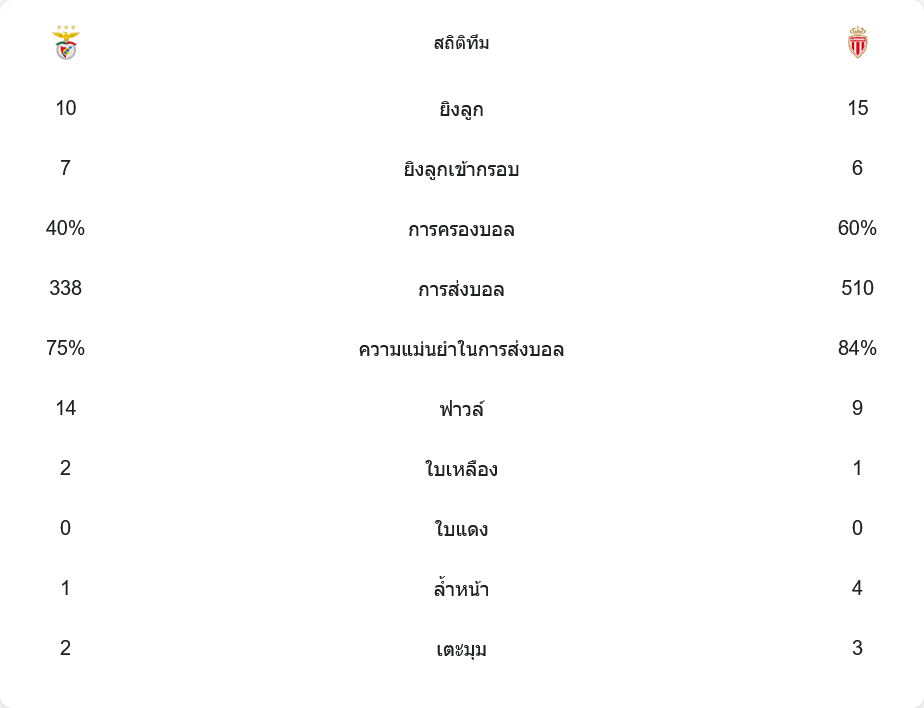 แม้ว่า เบนฟิก้า จะมีโอกาสยิงน้อยกว่า โมนาโก (10 ครั้ง เทียบกับ 15 ครั้ง) แต่พวกเขากลับมีอัตราการยิงเข้ากรอบที่แม่นยำกว่า โดยยิงเข้ากรอบถึง 7 ครั้ง เทียบกับโมนาโกที่มีเพียง 6 ครั้ง นอกจากนี้ โมนาโก ยังครองบอลได้มากกว่าที่ 60% ขณะที่เบนฟิก้าอยู่ที่ 40% แสดงให้เห็นถึงการเล่นที่รัดกุมของทีมเจ้าบ้านที่เน้นเกมโต้กลับและใช้โอกาสที่มีได้อย่างมีประสิทธิภาพ แม้โมนาโกจะจ่ายบอลแม่นยำกว่าที่ 84% เทียบกับ 75% ของเบนฟิก้า แต่พวกเขากลับโดนกดดันอย่างหนักและเสียถึง 3 ประตู เกมรับของทั้งสองทีมดุดันไม่แพ้กัน โดยเบนฟิก้าทำฟาวล์ถึง 14 ครั้ง และได้รับ 2 ใบเหลือง ส่วนโมนาโกทำฟาวล์ 9 ครั้ง และได้ 1 ใบเหลือง อย่างไรก็ตาม โมนาโกมีจังหวะโต้กลับที่อันตรายมากกว่าด้วยการสร้างโอกาสลุ้นประตูที่มากกว่า