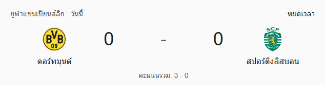 - นาทีที่ 47 กรรมการเป่านกหวีดจบครึ่งแรก โบรุสเซีย ดอร์ทมุนด์ 0-0 สปอร์ติ้ง ลิสบอน