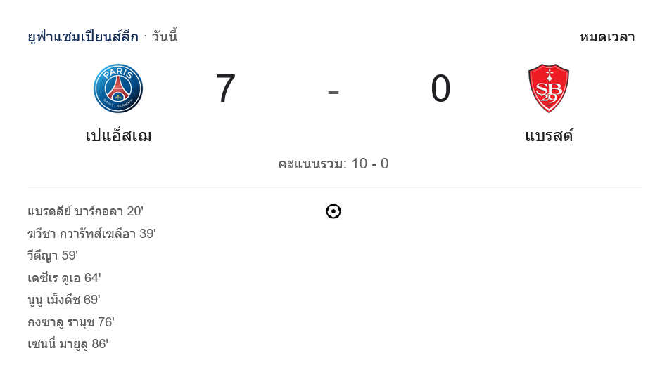 การถล่ม แบรสต์ ไปแบบขาดลอย ทำให้ ปารีส แซงต์ แชร์กแมง ทะลุเข้าสู่รอบ 16 ทีมสุดท้ายแบบไร้ข้อกังขา โดยในรอบต่อไปพวกเขาจะต้องพบกับ ผู้ชนะระหว่าง ลิเวอร์พูล หรือ บาร์เซโลน่า ซึ่งถือเป็นบททดสอบที่แท้จริงของยอดทีมจากลีกเอิง การแข่งขันนัดถัดไปของ เปแอสเช จะเป็นเกมสุดสำคัญในการตัดสินเส้นทางสู่รอบก่อนรองชนะเลิศ ติดตามโปรแกรมการแข่งขันทั้งหมดผ่าน ตารางบอล ที่อัปเดตใหม่เสมอบน บ้านกีฬา