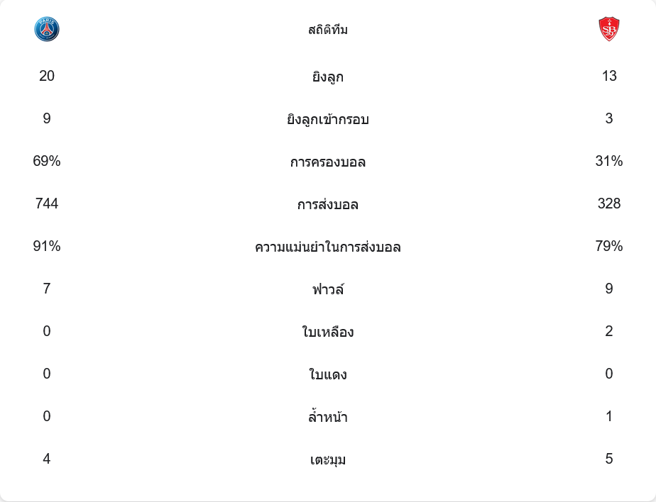 แม้ว่าแบรสต์จะพยายามเปิดเกมสู้ แต่ก็เป็น เปแอสเช ที่ครองบอลได้ถึง 69% และยิงถึง 20 ครั้ง ตรงกรอบ 9 ครั้ง ขณะที่ แบรสต์ มีโอกาสยิงเพียง 13 ครั้ง เข้ากรอบแค่ 3 ครั้ง เท่านั้น การส่งบอลและความแม่นยำของเจ้าบ้านก็ดีกว่าอย่างเห็นได้ชัดที่ 91% เทียบกับทีมเยือนที่มีแค่ 79%