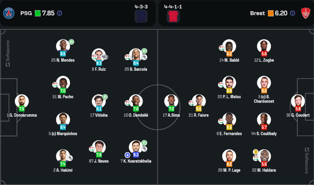 ไม่มีข้อสงสัยเลยว่า ควิชา ควารัตสเคเลีย สมควรเป็น Man of the Match เขาทำไป 1 ประตู 1 แอสซิสต์ และป่วนเกมรับของแบรสต์ตลอดทั้งเกม ได้คะแนนสูงถึง 9.3
