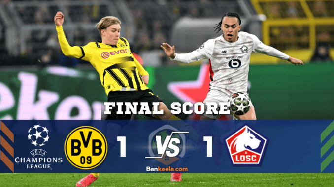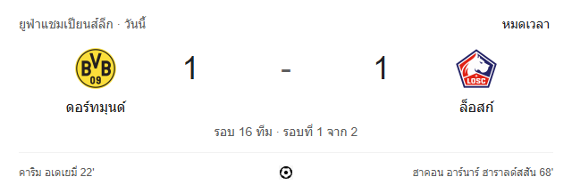 เกมนี้ โบรุสเซีย ดอร์ทมุนด์ มีโอกาสปิดเกมหลายครั้งหลังขึ้นนำ 1-0 ตั้งแต่ครึ่งแรก แต่แนวรับของลีลล์ยังต้านไว้ได้ จนกระทั่ง ฮาคอน ฮาราลด์สัน ยิงตีเสมอให้ทีมเยือนได้สำเร็จในครึ่งหลัง ทำให้สถานการณ์ของ “เสือเหลือง” ยังไม่ปลอดภัยนัก ก่อนต้องไปลุ้นกันในเกมที่สอง
