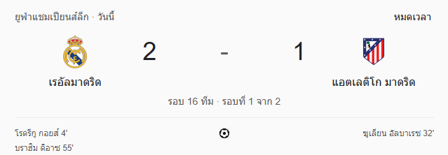 บ้านกีฬา พาคุณติดตาม ผลบอลสด ศึกยูฟ่าแชมเปียนส์ลีก รอบ 16 ทีมสุดท้าย นัดแรก ศึกมาดริดดาร์บี้แมตช์สุดดุเดือดที่สนามซานติอาโก้ เบร์นาเบว ระหว่าง เรอัล มาดริด ปะทะ แอตเลติโก มาดริด เกมนี้ทั้งสองทีมต่างงัดแทคติกออกมาสู้กันเต็มที่ แต่สุดท้ายเป็นทัพ ราชันชุดขาว ที่เฉือนเอาชนะไปได้ 2-1 กุมความได้เปรียบก่อนในนัดแรก