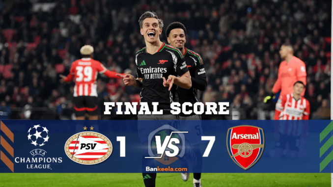 อาร์เซนอลโชว์คลาสของทีมระดับท็อป ด้วยการถล่มพีเอสวีแบบหมดรูป เกมรุกของพวกเขาจัดจ้าน ยิงได้หลากหลายรูปแบบ ทั้งลูกตั้งเตะ การเข้าทำจากแดนกลาง และเกมสวนกลับที่เฉียบขาด เกมนี้ มาร์ติน โอเดการ์ด เล่นได้โดดเด่น ยิง 2 ประตู และคุมจังหวะเกมได้อย่างเหนือชั้น ขณะที่พีเอสวีต้องกลับไปแก้เกมอย่างหนักก่อนบุกเยือนลอนดอนในนัดที่สอง