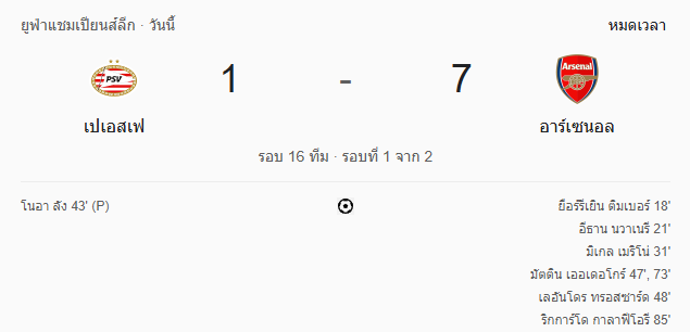 บ้านกีฬา พาคุณติดตาม ผลบอลสด ศึกยูฟ่าแชมเปียนส์ลีก รอบ 16 ทีมสุดท้าย นัดแรก พีเอสวี ไอนด์โฮเฟ่น เปิดรังฟิลิปส์ สตาดิโอน รับการมาเยือนของ “ไอ้ปืนใหญ่” อาร์เซนอล และกลายเป็นเกมที่ทีมเยือนโชว์ฟอร์มดุดัน ไล่ถล่มเจ้าบ้านแบบขาดลอย 7-1 กุมความได้เปรียบมหาศาลก่อนกลับไปเล่นที่เอมิเรตส์ สเตเดี้ยม นัดที่สอง