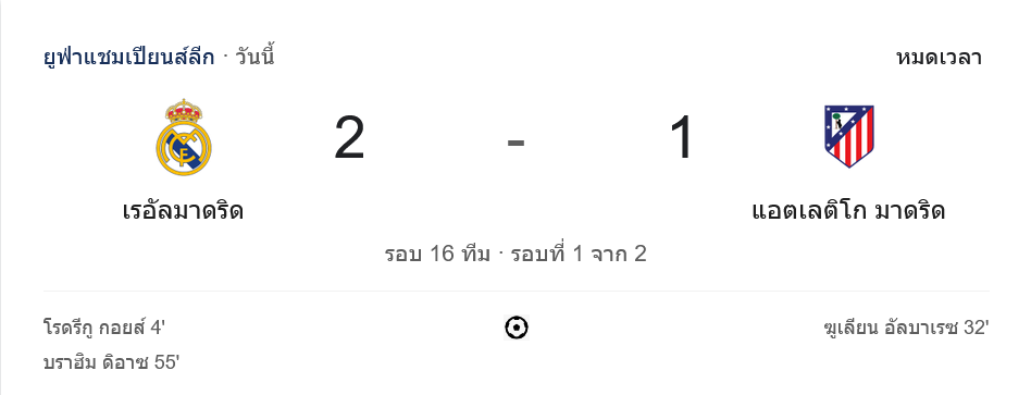 จาก : ผลบอลสด ยูฟ่าแชมเปียนส์ลีก 2024 ระหว่าง เรอัล มาดริด 2-1 แอตเลติโก มาดริด วันนี้ 5/3/68 – บ้านกีฬา