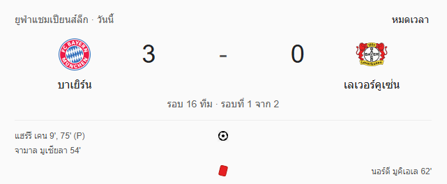 - นาทีที่ 49 กรรมการเป่าหมดครึ่งแรก บาเยิร์น มิวนิค 1-0 เลเวอร์คูเซ่น