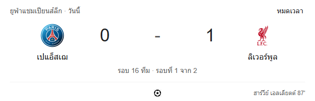 - หมดเวลาการแข่งขัน – ลิเวอร์พูลบุกชนะปารีส แซงต์ แชร์กแมง 1-0 กุมความได้เปรียบก่อนเกมเลกสองที่แอนฟิลด์!