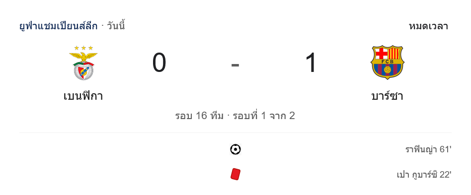 บาร์เซโลน่าคว้าความได้เปรียบในรอบ 16 ทีมสุดท้าย ด้วยสกอร์นำ 1-0 ก่อนกลับไปเล่นในบ้านของตัวเองในเลกที่สอง ขณะที่เบนฟิก้าต้องทำการบ้านหนักเพื่อกลับมาให้ได้ในการแข่งขันนัดถัดไป