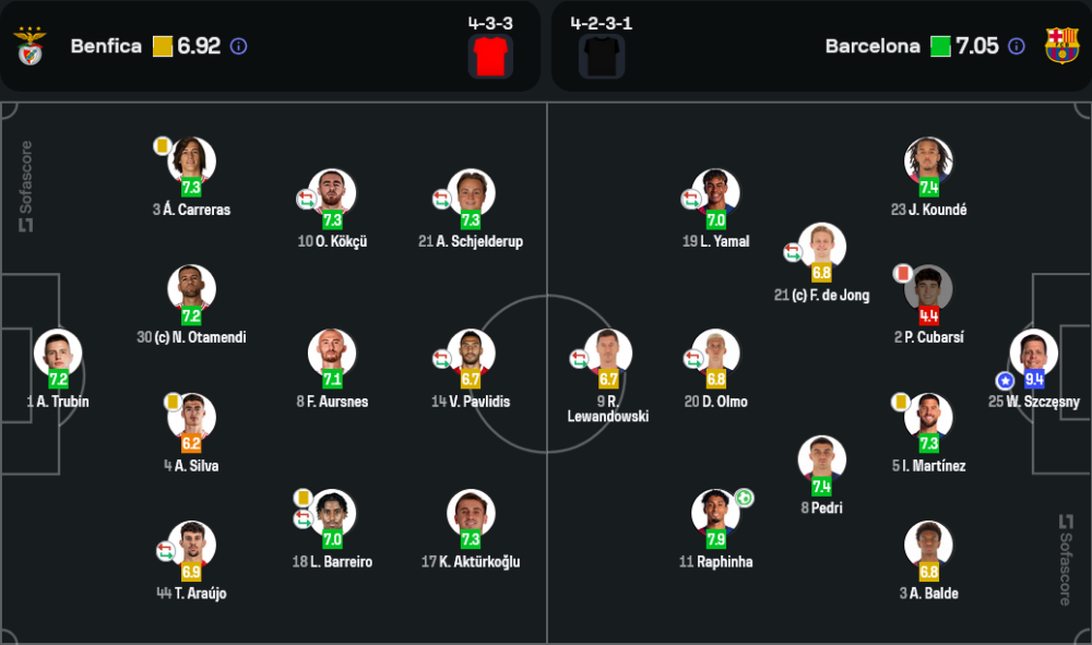 บาร์เซโลน่าใช้แผน 4-2-3-1 เน้นการโจมตีด้วยปีกและการเปิดบอลเข้ากลาง โดยมี ราฟินญ่า และ ลามีน ยามาล (L. Yamal) เป็นปีกที่สร้างความอันตรายให้กับแนวรับของเบนฟิก้า ขณะที่เบนฟิก้าใช้แผน 4-3-3 แต่การบุกไม่คมพอและขาดการจบสกอร์ที่ชัดเจน เกมรับของบาร์เซโลน่าทำได้ดีมาก โดยเฉพาะ วอยแชค ชแชนสนี่ ที่ทำหน้าที่ป้องกันได้อย่างยอดเยี่ยม