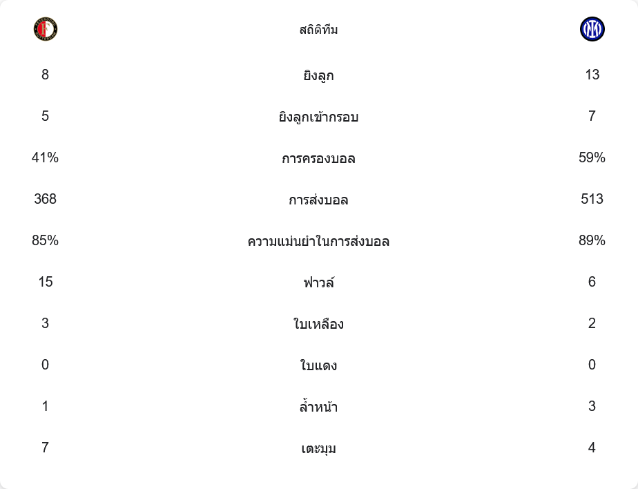 อินเตอร์ มิลาน ครองบอลได้ถึง 59% และมีการยิงลูกถึง 13 ครั้ง เข้ากรอบ 7 ครั้ง ขณะที่เฟเยนูร์ดยิงได้เพียง 8 ครั้ง เข้ากรอบ 5 ครั้ง การส่งบอลของอินเตอร์แม่นยำถึง 89% ขณะที่เฟเยนูร์ดทำได้ 85% การฟาล์ลของเฟเยนูร์ดสูงถึง 15 ครั้ง เปรียบเทียบกับอินเตอร์ที่ทำเพียง 6 ครั้ง ทำให้เห็นความแตกต่างของเกมรับและเกมบุกอย่างชัดเจน