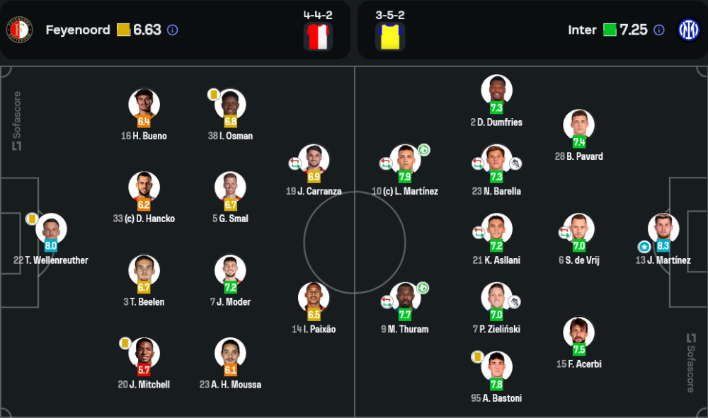 ขณะที่ เฟเยนูร์ด ใช้แผน 4-4-2 ที่ดูเหมือนจะเน้นรับและสวนกลับ แต่ไม่สามารถเจาะเกมรับของอินเตอร์ได้ เกมบุกของเฟเยนูร์ดขาดความคม และการต่อบอลไม่แม่นยำ ทำให้ไม่สามารถสร้างโอกาสทำประตูได้อย่างชัดเจน