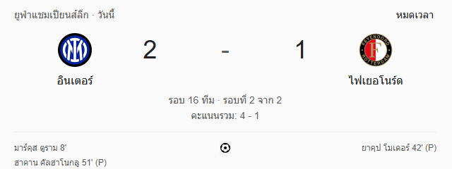 เกมนี้ อินเตอร์ มิลาน แสดงให้เห็นถึงความเฉียบคมและความเด็ดขาดในการจบสกอร์ แม้เฟเยนูร์ดจะพยายามตอบโต้และมีจังหวะได้ลุ้นหลายครั้ง แต่ก็ไม่อาจต้านความแข็งแกร่งของเจ้าถิ่นได้ ทำให้สุดท้าย อินเตอร์ เป็นฝ่ายคว้าชัยและผ่านเข้าสู่รอบ 8 ทีมสุดท้ายได้สำเร็จ