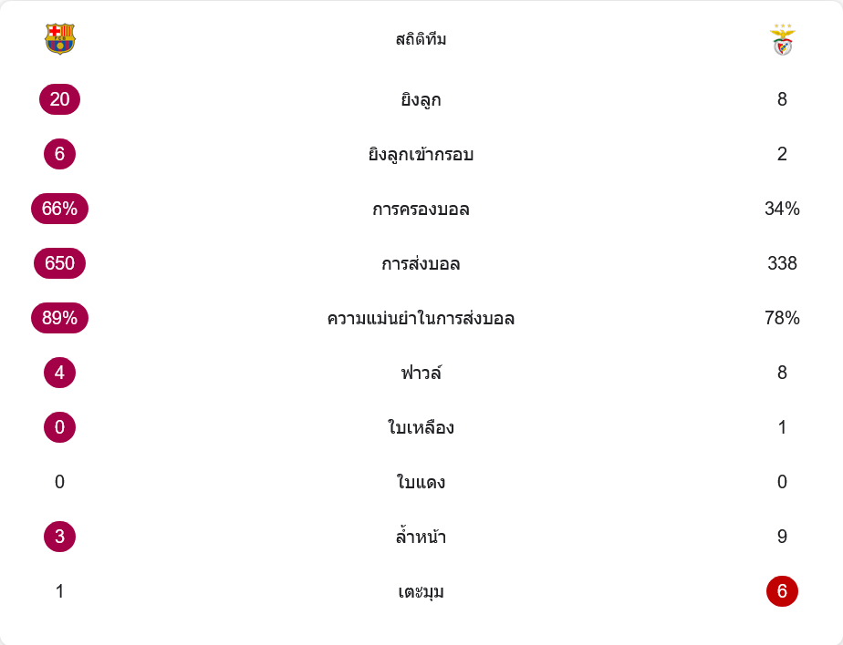 บาร์เซโลน่า เด่นชัดทุกด้าน ครองบอล 66% ยิง 20 ครั้ง ตรงกรอบ 6 ครั้ง ส่วน เบนฟิก้า ครองบอลเพียง 34% ยิงตรงกรอบแค่ 2 ครั้ง ฟาวล์รวมกัน 12 ครั้ง แต่เจ้าบ้านคุมเกมได้หมด