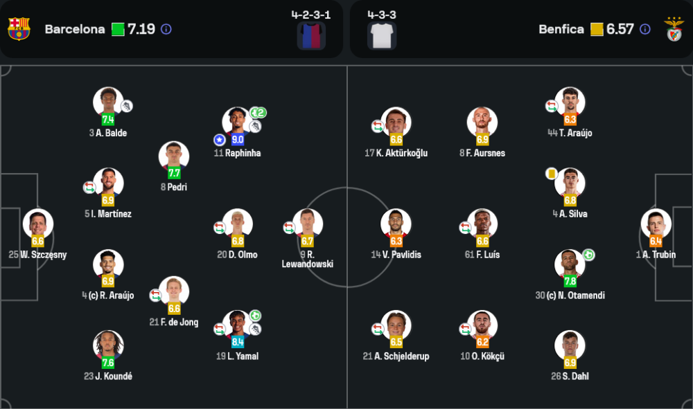 บาร์เซโลน่า ใช้ระบบ 4-2-3-1 ที่ยืดหยุ่นได้ดี โดยมี ราพินญ่า และ ลามีน ยามาล เป็นตัวลากเลื้อยทางริมเส้น ขณะที่ เลวานดอฟสกี้ แม้ไม่ได้ยิงประตู แต่ช่วยเปิดพื้นที่ให้เพื่อนเล่นง่ายขึ้น แผงมิดฟิลด์คุมเกมอยู่หมัดโดย เปดรี และ เดอ ยอง ส่วนแนวรับแทบไม่พลาดเลย