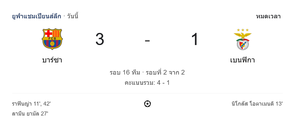 จาก : ผลบอลสด ยูฟ่าแชมเปียนส์ลีก 2024 บาร์เซโลน่า 3-1 เบนฟิก้า วันนี้ 12/3/68 – บ้านกีฬา