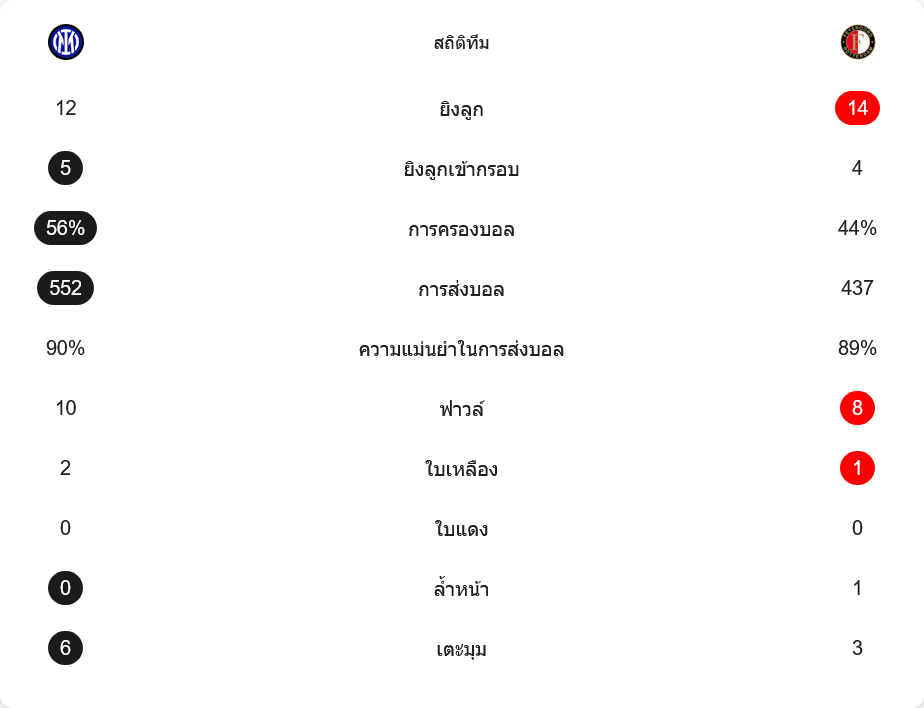 อินเตอร์ มิลาน ครองบอลได้มากกว่าที่ 56% และมีความแม่นยำในการจ่ายบอลถึง 90% จากการจ่ายทั้งหมด 552 ครั้ง แสดงให้เห็นถึงการคอนโทรลเกมที่เหนือกว่า เฟเยนูร์ด ที่ครองบอลเพียง 44% และมีความแม่นยำในการจ่ายบอล 89% จาก 437 ครั้ง อย่างไรก็ตาม ทีมเยือนกลับมีโอกาสยิงมากกว่าที่ 14 ครั้ง แต่เข้ากรอบเพียง 4 ครั้ง ในขณะที่เจ้าบ้านมีโอกาสยิง 12 ครั้ง และเข้ากรอบถึง 5 ครั้ง ซึ่งสะท้อนให้เห็นถึงความเฉียบคมในการจบสกอร์ของอินเตอร์