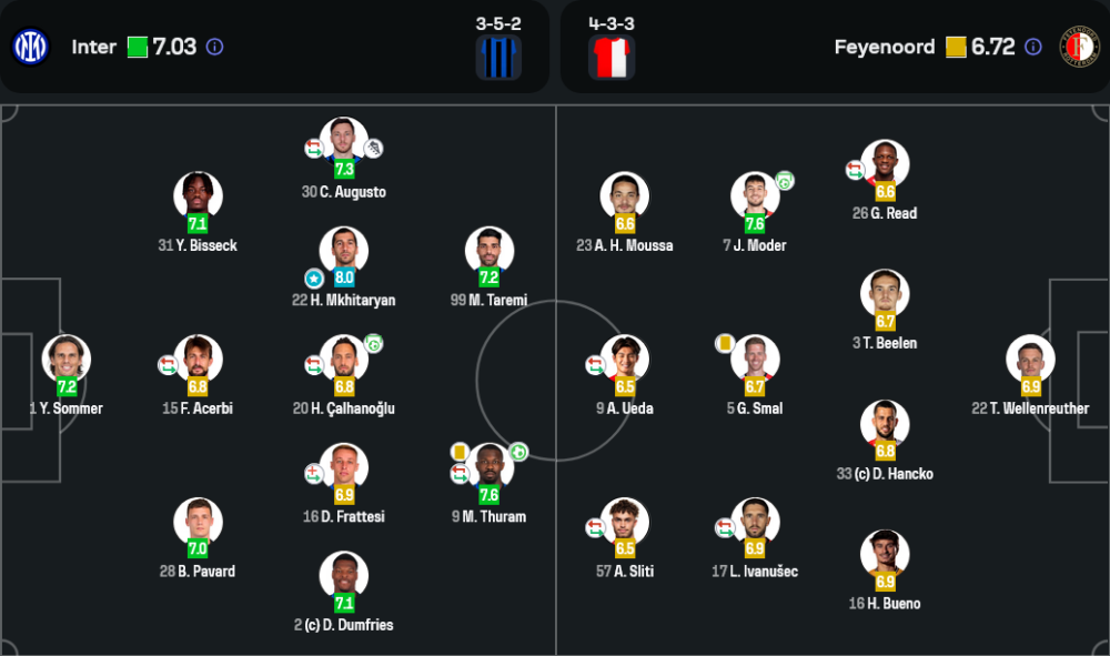 • กองกลาง: เดนเซล ดุมฟรีส์ (7.1), ฮาคาน ชัลฮาโนกลู (6.8), ดาวิเด้ ฟรัตเตซี่ (6.9), เฮนริค มคิทาร์ยาน (8.0 ⭐), คาร์ลอส ออกุสโต้ (7.3)