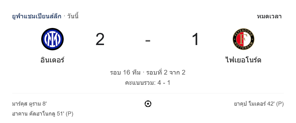 บ้านผลบอล สรุปหลังเกม อินเตอร์ มิลาน โชว์ความแข็งแกร่ง! เปิดบ้านเชือด เฟเยนูร์ด 2-1 ลิ่วรอบต่อไปศึก ยูฟ่าแชมเปียนส์ลีก