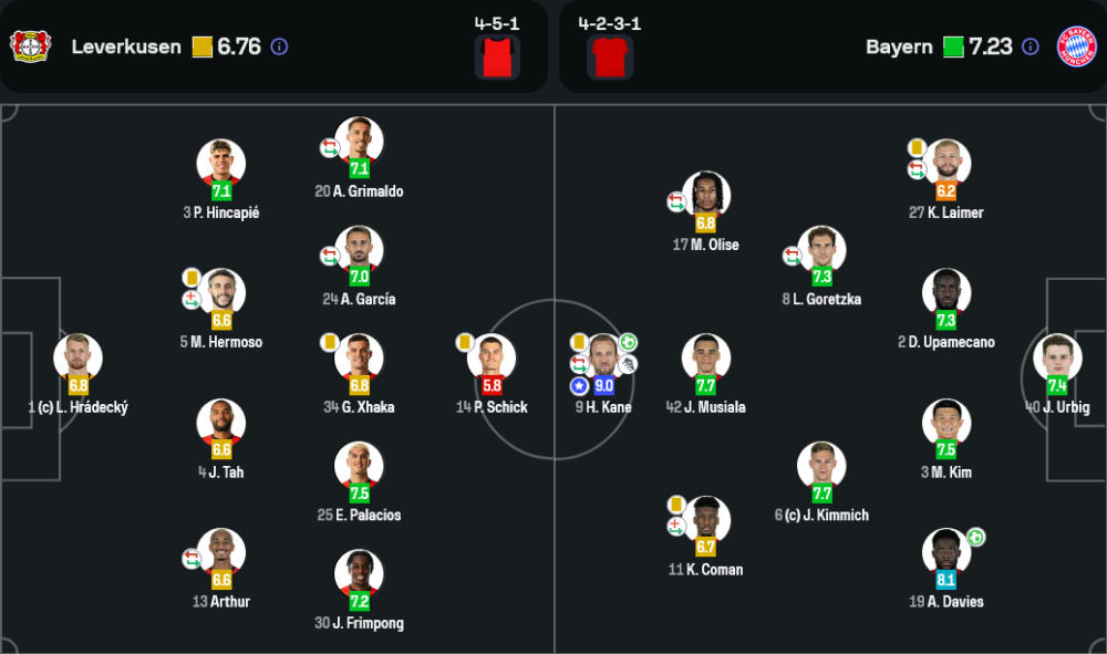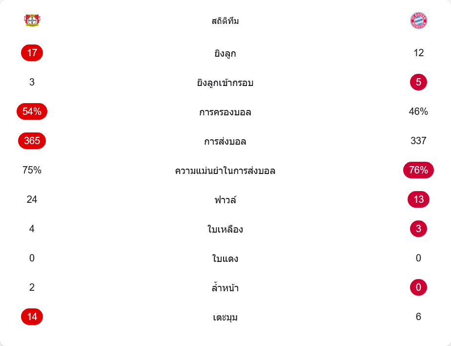 แม้ว่า เลเวอร์คูเซ่น จะครองบอลมากกว่าที่ 54% และมีโอกาสยิงมากถึง 17 ครั้ง แต่ปัญหาหลักของพวกเขาคือการขาดความเด็ดขาดในจังหวะสุดท้าย ขณะที่ บาเยิร์น มิวนิค ใช้การครองบอลที่น้อยกว่า (46%) แต่สร้างโอกาสที่อันตรายกว่า และมีความแม่นยำในการส่งบอลที่ดีกว่า 76% เทียบกับ 75% ของเลเวอร์คูเซ่น