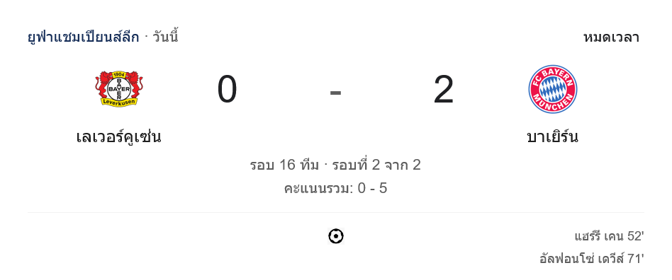 จาก : ผลบอลสด ยูฟ่าแชมเปียนส์ลีก 2024 ระหว่าง ไบเออร์ เลเวอร์คูเซิน 0-2 บาเยิร์น มิวนิค วันนี้ 12/3/68 – บ้านกีฬา