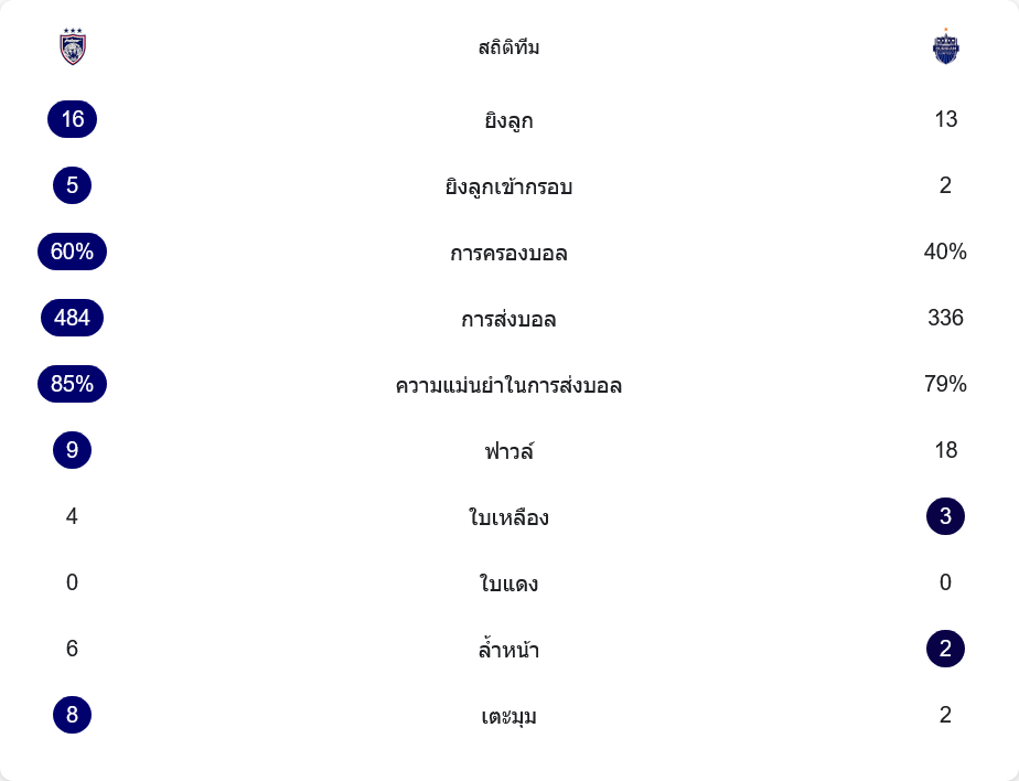 - การผ่านบอลสำเร็จ: ยะโฮร์ 484 ครั้ง – 336 ครั้ง บุรีรัมย์