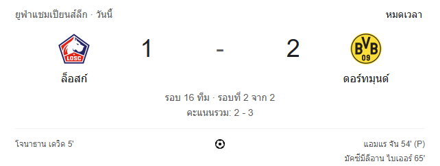 - นาทีที่ 45+2 กรรมการเป่าหมดครึ่งแรก ลีลล์ 1-0 โบรุสเซีย ดอร์ทมุนด์