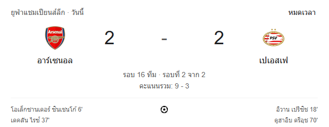 - นาทีที่ 94 กรรมการเป่าหมดเวลา อาร์เซน่อล เสมอ พีเอสวี ไอนด์โฮเฟ่น 2-2!