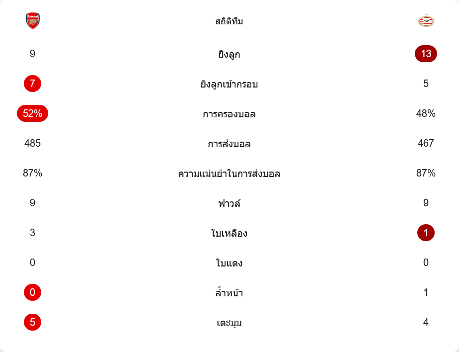 แม้ว่าอาร์เซนอลจะครองบอลมากกว่าที่ 52% ขณะที่พีเอสวีมี 48% แต่ทีมเยือนกลับสร้างโอกาสจบสกอร์ได้มากกว่าที่ 13 ครั้ง เทียบกับอาร์เซนอลที่ยิง 9 ครั้ง อาร์เซนอลมีโอกาสยิงเข้ากรอบ 7 ครั้ง ส่วนพีเอสวีเข้ากรอบ 5 ครั้ง การจ่ายบอลของทั้งสองทีมถือว่าใกล้เคียงกัน โดยอาร์เซนอลจ่าย 485 ครั้ง และพีเอสวี 467 ครั้ง ทั้งสองทีมมีความแม่นยำในการผ่านบอลเท่ากันที่ 87% เกมนี้มีใบเหลืองเกิดขึ้นทั้งหมด 4 ใบ โดยอาร์เซนอลได้ 3 ใบ และพีเอสวี 1 ใบ นอกจากนี้ อาร์เซนอลมีลูกเตะมุมมากกว่า 5 ครั้ง เทียบกับพีเอสวีที่ได้ 4 ครั้ง