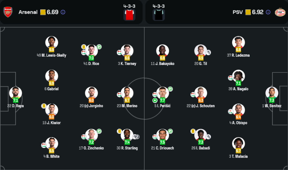 อาร์เซนอลใช้แผน 4-3-3 โดยเน้นเกมรุกทางริมเส้นจาก สเตอร์ลิ่ง และ ลูอิส-สเกลลี่ ซึ่งสร้างปัญหาให้แนวรับพีเอสวีพอสมควร ขณะที่แผงกองกลางมี ไรซ์ และ เมริโน่ คอยคุมเกม ส่วน พีเอสวี ก็เล่นด้วยแผน 4-3-3 เช่นกัน โดยให้ เปริซิช และ บากาโยโก้ เป็นตัวความหวังในเกมรุก เกมนี้พีเอสวีมีโอกาสจบสกอร์มากกว่า แต่แนวรับของอาร์เซนอลยังช่วยกันได้ดี