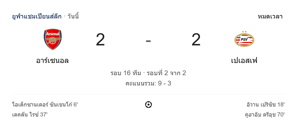 จาก : ผลบอลสด ยูฟ่าแชมเปียนส์ลีก 2024 อาร์เซนอล 2-2 พีเอสวี ไอนด์โฮเฟ่น วันนี้ 13/3/68 – บ้านกีฬา