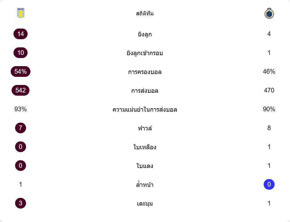 เกมนี้ แอสตัน วิลล่าครองบอล 54% เหนือกว่าคลับบรูซที่มี 46% แต่สิ่งที่แตกต่างอย่างชัดเจนคือโอกาสยิง วิลล่ายิงทั้งหมด 14 ครั้ง เข้ากรอบ 10 ครั้ง ขณะที่คลับบรูซยิงเพียง 4 ครั้ง และเข้ากรอบเพียง 1 ครั้ง การผ่านบอลของวิลล่าก็ทำได้ดีกว่า โดยมีการจ่ายบอล 542 ครั้ง เทียบกับคลับบรูซที่ทำได้ 470 ครั้ง ความแม่นยำในการผ่านบอลของวิลล่าทำได้ถึง 93% ขณะที่คลับบรูซแม่นยำ 90% เกมนี้มีใบแดง 1 ใบ ที่ทำให้คลับบรูซต้องเจอปัญหาอย่างหนัก