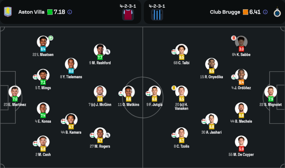แอสตัน วิลล่าเลือกใช้แผน 4-2-3-1 ที่มี ตีเลอมันส์ และ กามาร่า คุมจังหวะเกมกลางสนาม พร้อมให้ แม็คกินน์ คอยสนับสนุนเกมรุก ซึ่งได้ผลอย่างดีเยี่ยม พวกเขาใช้การต่อบอลที่แม่นยำและการโจมตีจากริมเส้นเป็นอาวุธสำคัญ ขณะที่คลับบรูซที่เหลือ 10 คนตั้งแต่นาทีที่ 16 ต้องเล่นเกมรับเกือบตลอดทั้งเกม ทำให้พวกเขาสร้างโอกาสได้น้อยมาก และสุดท้ายพ่ายไปอย่างหมดรูป