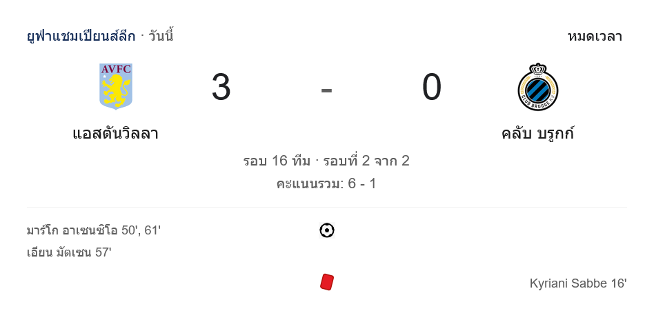 แอสตัน วิลล่าผ่านเข้าสู่รอบ 8 ทีมสุดท้ายของ ยูฟ่าแชมเปียนส์ลีก ได้สำเร็จด้วยฟอร์มสุดแข็งแกร่ง ส่วน คลับบรูซ ต้องกลับไปโฟกัสที่ โปรลีก เบลเยียม และ เบลเยียน คัพ เพื่อกู้ศักดิ์ศรีของทีมกลับมา