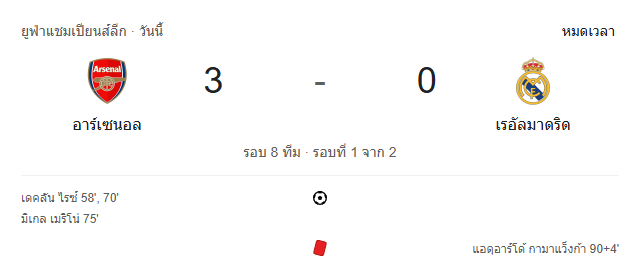 อาร์เซน่อลแสดงให้เห็นว่า “นี่แหละของจริง” เมื่อจัดการเรอัล มาดริดแบบหมดรูป 3-0 พร้อมกุมความได้เปรียบมหาศาลก่อนบุกไปเยือนในเลกสองที่สเปน เกมนี้ทั้ง เดแคลน ไรซ์ และ เมริโน่ ทำผลงานระดับโลก ขณะที่เกมรับแทบไม่เปิดช่องให้แนวรุกของมาดริดได้ทำงานสะดวก แม้จะมีจังหวะลุ้นแต่ก็ไม่เฉียบพอ โดยเฉพาะการโดนใบแดงของ คามาวิงก้า ในช่วงท้ายเกมที่ทำให้ ผลบอลสด ตอกย้ำชัยชนะของเจ้าถิ่นได้แบบไร้ข้อกังขา