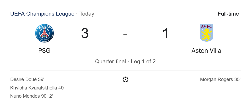 ค่ำคืนแห่งศึกยูฟ่าแชมเปียนส์ลีก 2025 รอบก่อนรองชนะเลิศนัดแรก ที่สนามปาร์ก เด แพร็งซ์ แฟนบอลทั่วโลกที่เกาะติด ผลบอลสด ต้องได้ลุ้นกันสุดตัวเมื่อ ปารีส แซงต์-แชร์กแมง เปิดบ้านรับมือ แอสตัน วิลล่า จากอังกฤษ เกมนี้เปี่ยมด้วยจังหวะบุกดุดันและจังหวะพลิกเกมสุดระทึก ก่อนจะจบลงด้วยชัยชนะ 3-1 ของทีมเจ้าบ้าน