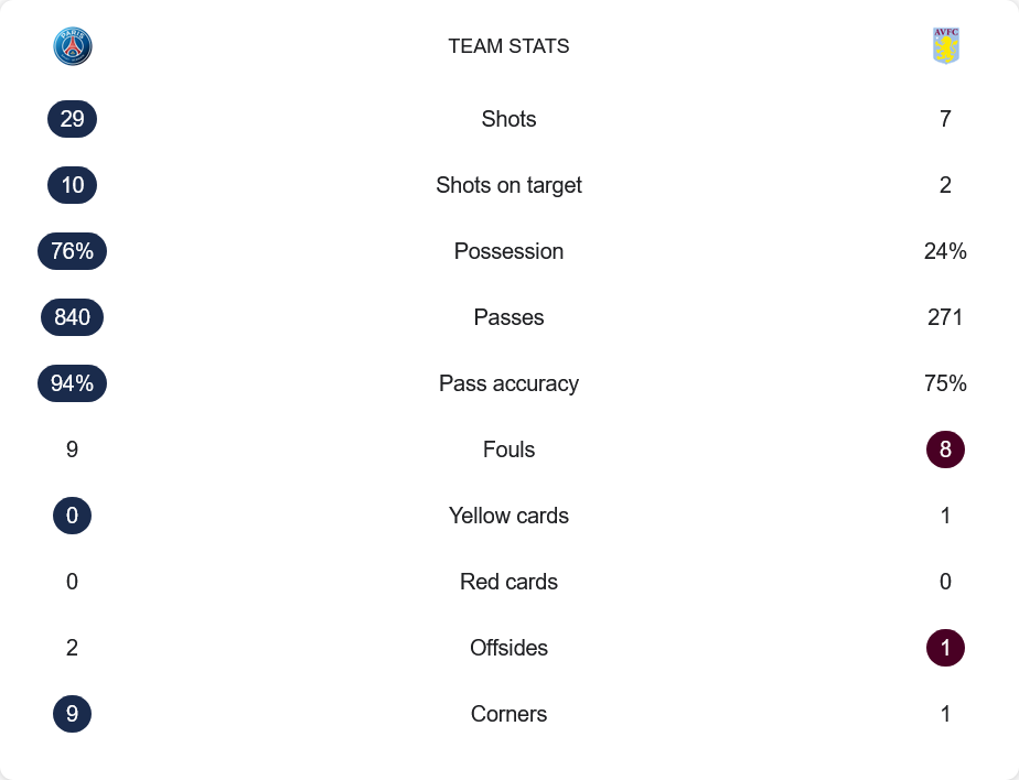 เปแอสเชเหนือกว่าวิลล่าแบบคนละชั้น โดยครองบอลถึง 76% ต่อ 24% และมีโอกาสยิงถึง 29 ครั้ง เข้ากรอบ 10 ขณะที่ทีมเยือนยิงเพียง 7 ครั้ง ตรงกรอบ 2 หน เปแอสเชจ่ายบอลได้ถึง 840 ครั้ง สำเร็จ 94% ส่วนวิลล่าจ่ายได้เพียง 271 ครั้ง สำเร็จ 75% เปแอสเชฟาวล์ 9 ครั้ง ไม่มีใบเหลือง ด้านวิลล่าโดนใบเหลือง 1 ใบ และมีฟาวล์ 8 ครั้ง เปแอสเชได้เตะมุมถึง 9 หน ขณะที่วิลล่าได้เพียง 1