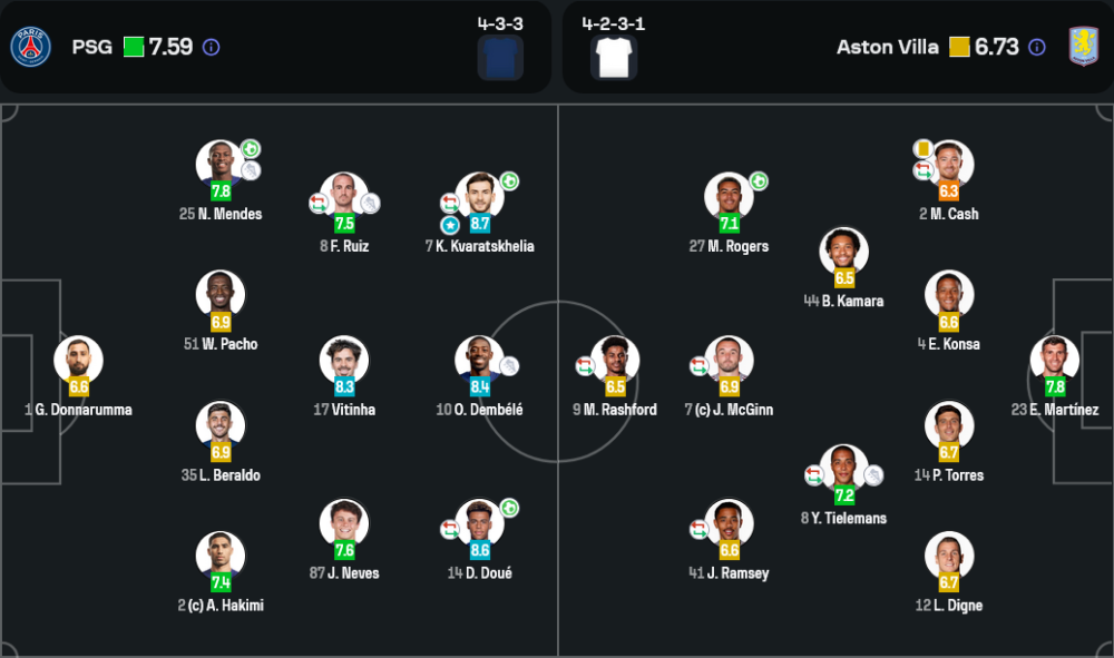 ควารัตส์เคเลีย สร้างความแตกต่างในเกมนี้อย่างชัดเจน ไม่เพียงแต่ยิงประตูสำคัญให้ทีมขึ้นนำในครึ่งหลัง แต่ยังมีบทบาทในการลากพาบอลขึ้นหน้า ทำเกมรุกริมเส้น และสร้างแรงกดดันใส่แนวรับวิลล่าอย่างต่อเนื่อง เรตติ้ง 8.7 คือเครื่องยืนยันถึงอิทธิพลของเขาในแมตช์นี้