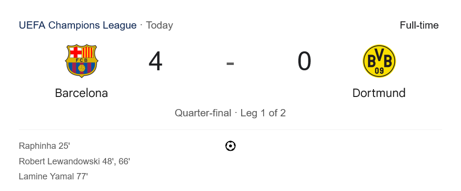ชัยชนะ 4-0 ในนัดแรกของรอบก่อนรองชนะเลิศ UCL ทำให้บาร์เซโลนากุมความได้เปรียบมหาศาลก่อนบุกไปเยือนดอร์ทมุนด์ในเลกสอง ด้วยฟอร์มแบบนี้หากไม่เกิดปาฏิหาริย์ ทีมของฮันส์ ฟลิค มีโอกาสสูงที่จะทะลุเข้าสู่รอบตัดเชือก ส่วนดอร์ทมุนด์ต้องกลับไปทำการบ้านหนัก หากหวังจะพลิกสถานการณ์ให้ได้ในบ้านของตัวเอง
