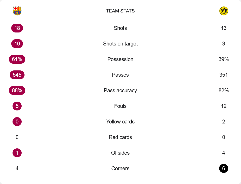 บาร์เซโลนาเป็นฝ่ายครองบอลเหนือกว่าด้วยอัตราการครองบอล 61% ต่อ 39% มีโอกาสยิงถึง 18 ครั้ง เข้ากรอบ 10 ครั้ง ขณะที่ดอร์ทมุนด์ยิงได้ 13 ครั้งแต่ตรงกรอบเพียง 3 เกมบุกของทีมเจ้าบ้านมีความแม่นยำสูงด้วยอัตราจ่ายบอลสำเร็จ 88% จากทั้งหมด 545 ครั้ง ส่วนดอร์ทมุนด์ทำได้ 82% จาก 351 ครั้ง การฟาวล์เกิดขึ้นเพียง 5 ครั้งจากฝั่งเจ้าบ้าน ขณะที่ดอร์ทมุนด์ทำฟาวล์ถึง 12 ครั้ง โดนไป 2 ใบเหลือง บาร์ซาไม่มีใบเหลืองเลยในเกมนี้
