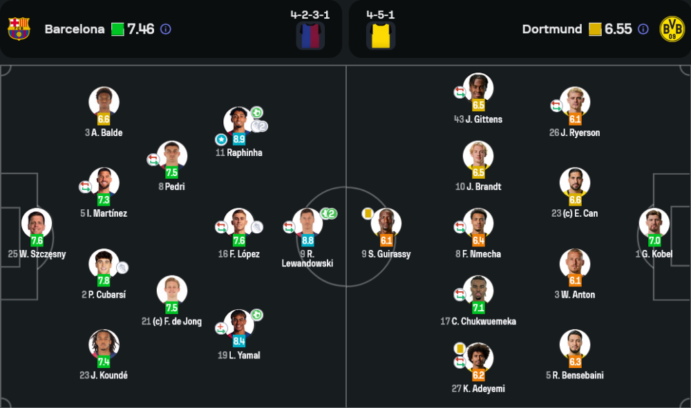 ราฟินญา (เรตติ้ง 8.9 – ยิง 1 แอสซิสต์ 2), เลวานดอฟสกี้ (8.8 – ยิง 2), ลามีน ยามาล (8.4 – ยิง 1)