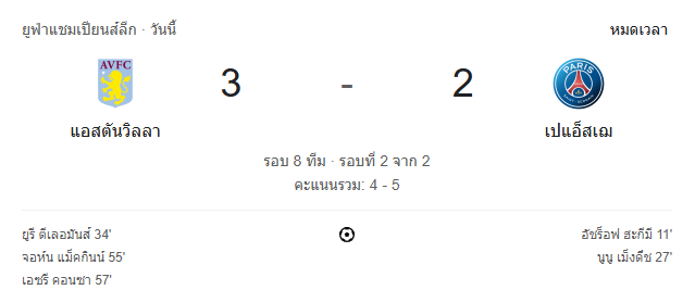 หมดเวลา 90+4 นาที วิลล่าชนะ 3-2 แต่รวมสองนัดยังคงเป็น เปแอสเชที่เข้ารอบด้วยสกอร์รวม 5-4