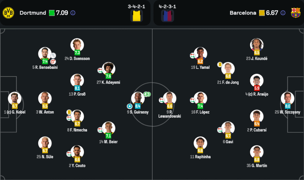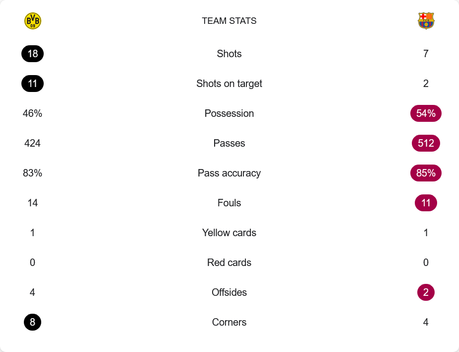 แม้ดอร์ทมุนด์จะมีเปอร์เซ็นต์การครองบอลน้อยกว่า (46%) แต่พวกเขาแสดงให้เห็นถึงความเฉียบคมในเกมรุกด้วยการยิงทั้งหมด 18 ครั้ง เข้ากรอบถึง 11 ครั้ง ขณะที่บาร์เซโลน่าครองบอลได้มากถึง 54% จ่ายบอลแม่นยำกว่า (512 ครั้ง, ความแม่นยำ 85%) แต่กลับยิงเข้ากรอบแค่ 2 ครั้งเท่านั้น ซึ่งถือว่าน้อยมากเมื่อเทียบกับโอกาสที่ควรจะมี เกมนี้ยังมีฟาวล์รวม 25 ครั้ง ใบเหลืองฝั่งละหนึ่งใบ ไม่มีใบแดง และดอร์ทมุนด์ได้เตะมุมมากกว่าถึงสองเท่า (8 ต่อ 4)