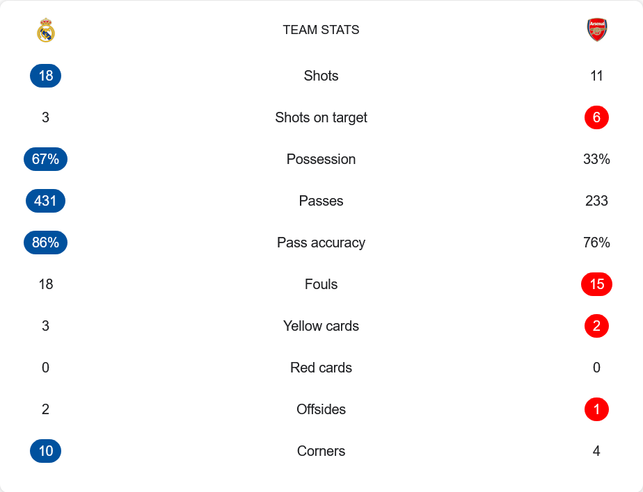 แม้จะพ่ายในเกมนี้แต่ เรอัล มาดริด เหนือกว่าในหลายตัวเลข พวกเขาครองบอลถึง 67% ผ่านบอลทั้งหมด 431 ครั้งด้วยความแม่นยำ 86% และยิงรวม 18 ครั้ง แต่เข้ากรอบเพียง 3 ขณะที่ อาร์เซนอล แม้จะครองบอลแค่ 33% แต่มีความเฉียบคมกว่า ยิงเข้ากรอบ 6 จาก 11 ครั้ง และใช้โอกาสได้คุ้มค่ากว่าชัดเจน เกมนี้จึงเป็นตัวอย่างของ “ชนะเกมแม้ไม่ได้ครองบอล”